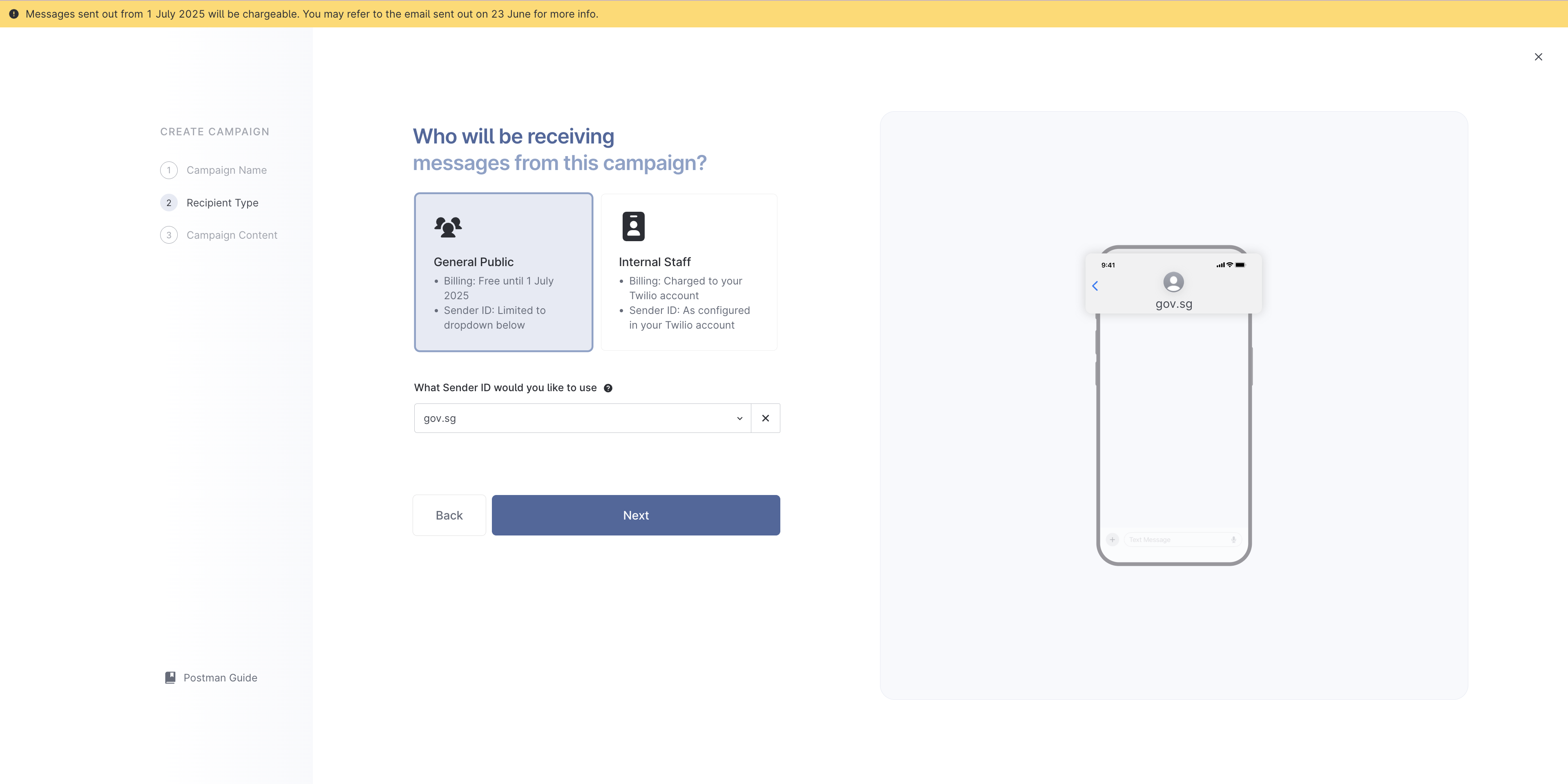 7. Generate API keys for your SMS campaign by following this [guide](https://postman-v2.guides.gov.sg/postman-v2-admin-portal-for-api-users-mop/campaign-settings#api-keys). You will need this when setting up Plumber later.